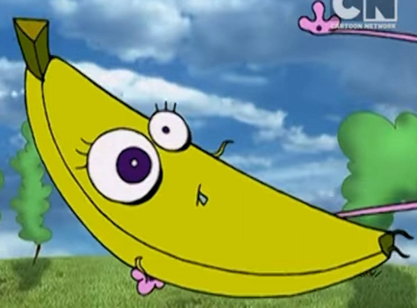 While in the Banana Republic, a hungry Courage notices a small banana on the grass. When he picks up the banana a small face appears on it before it starts screaming and crying. Hearing the cries the mother banana appears before she hits Courage with her handbag and takes her baby from him. She reports the attempted kidnapping of her baby to the Banana Police.