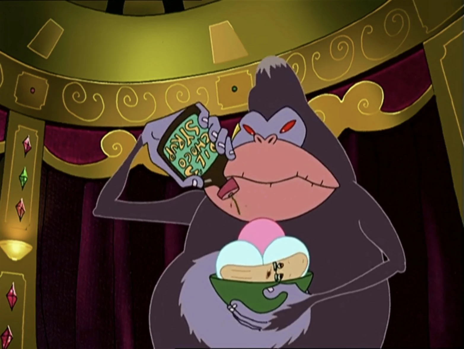 However, the scam was King Kong's idea and he forced his nephew to disguise himself as the Ruler of the Banana People. At the near end, King Kong is overpowered by the Banana People, and at the stage, King Kong is seen playing a barrel organ with the Monkey, now wearing a hat and a vest, hopping around holding a mug.
