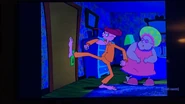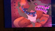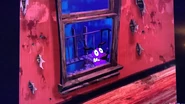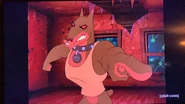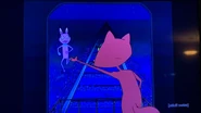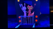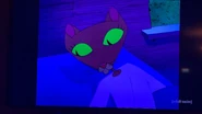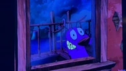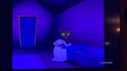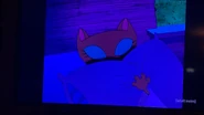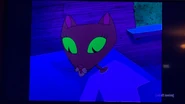 After eating, Muriel prepares a room for Kitty in the garret. As everyone prepares for bed, Courage spies on Kitty to see her with a toy mouse that was a gift from Bunny. Once Kitty takes off her mask, Courage is terrified to learn she is actually a cat and becomes wholly convinced that the mask is evil as he begins to generate frightening thoughts. Courage frantically tells Muriel and Eustace that the Mask is an evil monster to no avail. So, in an attempt to protect them, Courage locks his owners and Kitty in their rooms while he steals the latter's toy mouse, supposedly as evidence for the police.